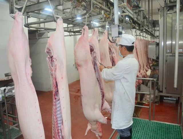 毛豬車輛入廠時(shí)嚴(yán)格車輪消毒池和人員專用通道消毒;卸車后經(jīng)過清洗、消毒、烘干等環(huán)節(jié)徹底消殺后方可出廠,確保安全;