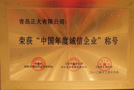 在商務(wù)部國際貿(mào)易經(jīng)濟合作研究院、工業(yè)和信息化部中小企業(yè)發(fā)展促進中心、《經(jīng)濟》雜志社聯(lián)合組織的2012年“中國年度誠信企業(yè)”評選活動中,青島正大有限公司榮獲“中國年度誠信企業(yè)”殊榮。